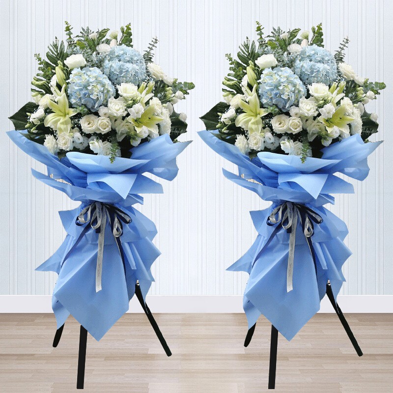 花 材:两支绣球,白玫瑰一扎,白色洋桔梗一扎,两支白色多头百合,搭配尤加利叶,散尾葵,八角叶,满天星装饰。蓝色欧雅纸多层花束包装,蓝白色花结。