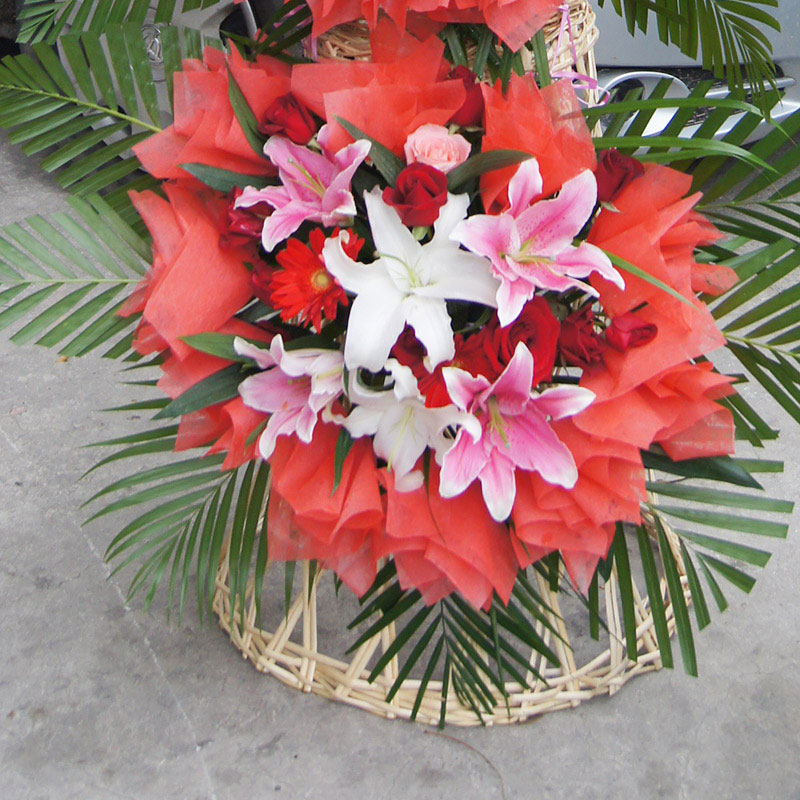 花材: 香水百合一扎,红玫瑰一扎,红掌半扎,散尾葵适量,红色棉纸包裹,三层花架。