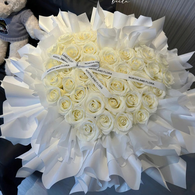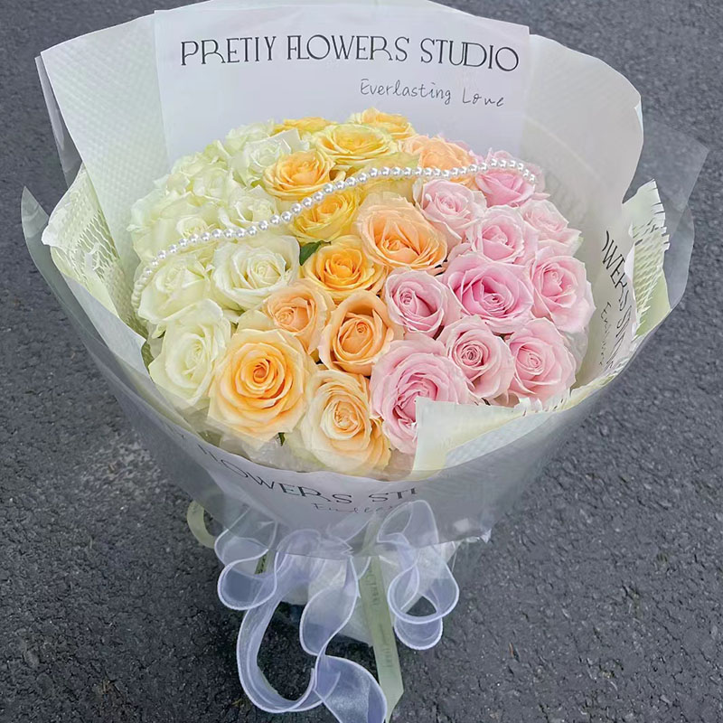 【春风化雨】19支香槟玫瑰,搭配10支白色洋桔梗(断货则用12支白玫瑰代替),尤加利叶装饰。