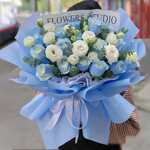 【晚风告白】15枝碎冰蓝玫瑰,5枝多头白桔梗,尤加利叶间插点缀。
