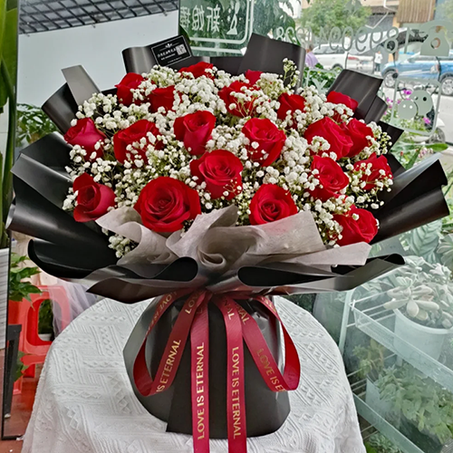 【如胶似漆】精选19枝优质红玫瑰,搭配白色满天星丰满装饰。