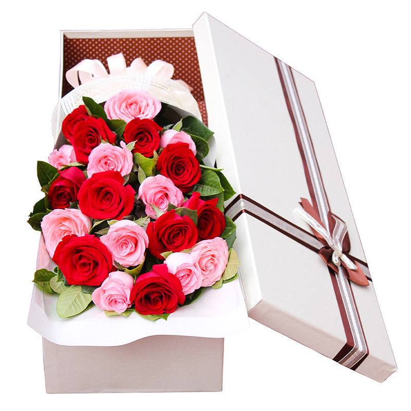 【百事可爱】精选19朵混搭玫瑰(11朵红玫瑰、8朵粉玫瑰),搭配栀子叶等绿叶装饰。