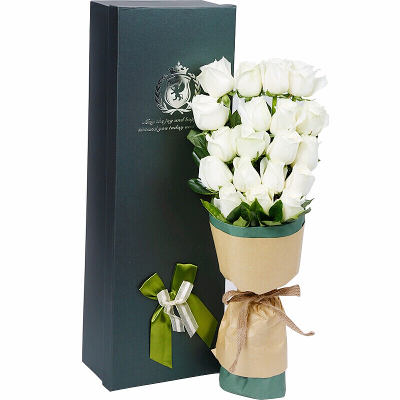 【纯真浪漫】精选19枝顶级白玫瑰,搭配绿叶点缀。