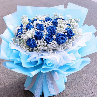 【星河爱恋】19朵精品蓝色妖姬,搭配大量满天星装饰。