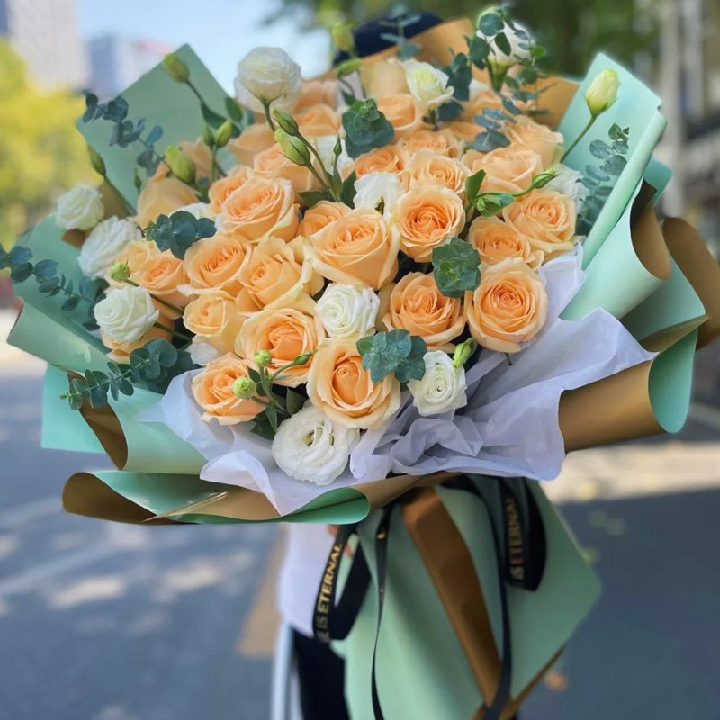 【声声祝福】33朵香槟玫瑰,8支洋桔梗(断货则用同数量白玫瑰代替),搭配尤加利叶装饰。