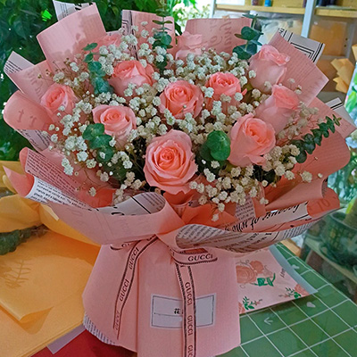 【粉色心情】11枝粉玫瑰,搭配白色满天星、尤加利叶丰满间插。