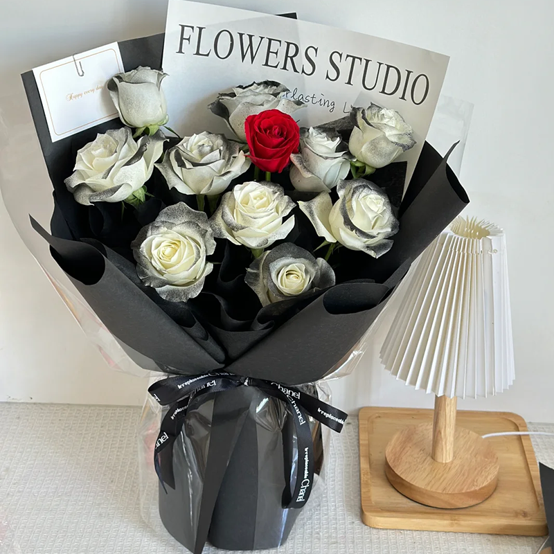 花材: 精选10朵黑骑士玫瑰,1朵红玫瑰。