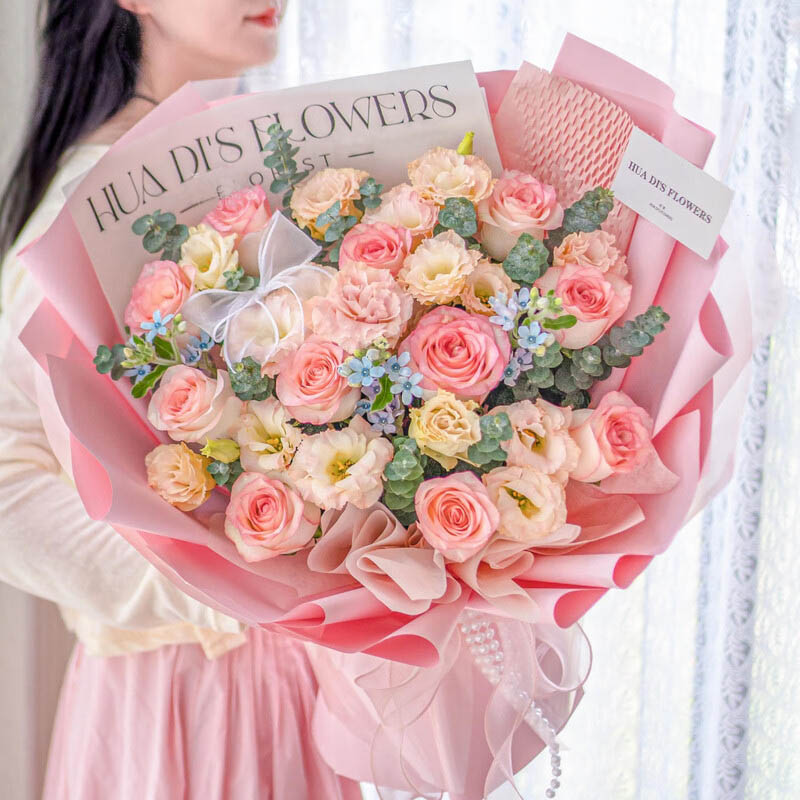 花材: 11朵粉玫瑰,6支多头香槟桔梗,搭配蓝星花、尤加利叶装饰。