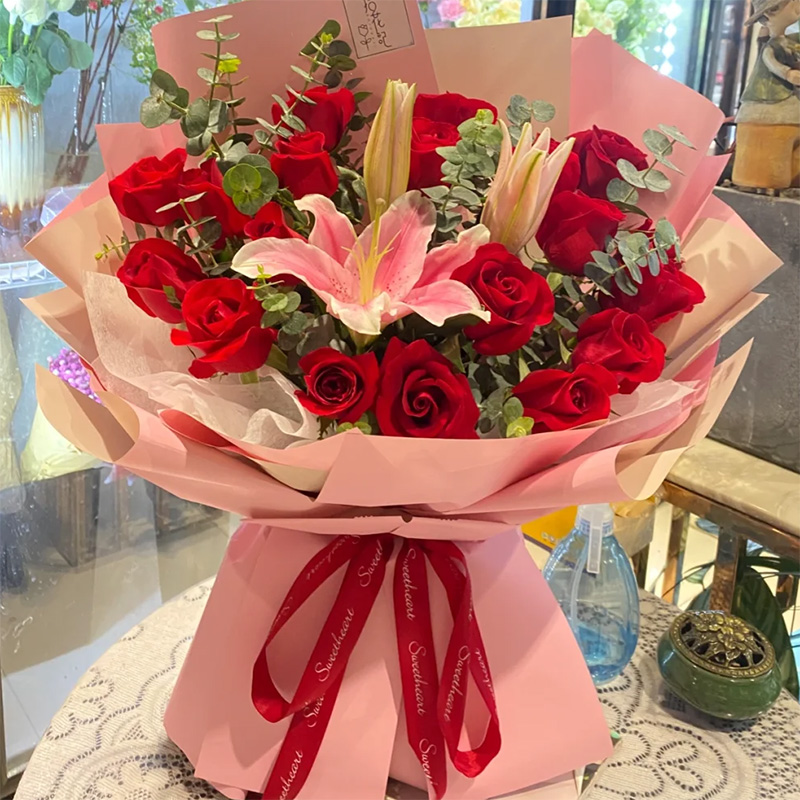 花材: 19枝卡罗拉红玫瑰,1枝多头粉百合,搭配尤加利叶装饰。