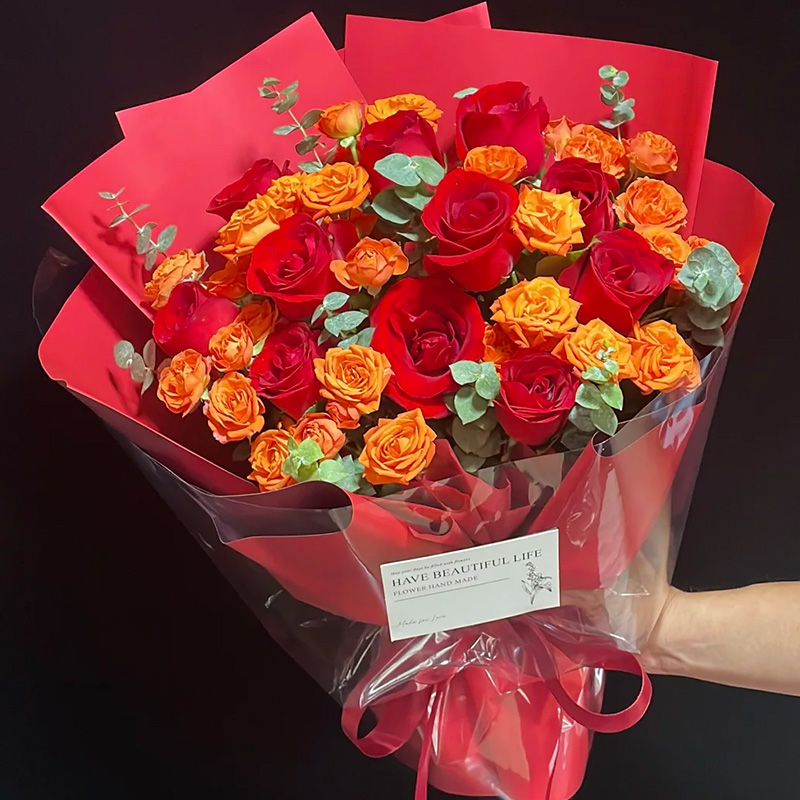 花材: 11枝红玫瑰,8枝多头橙芭比,搭配尤加利叶装饰。