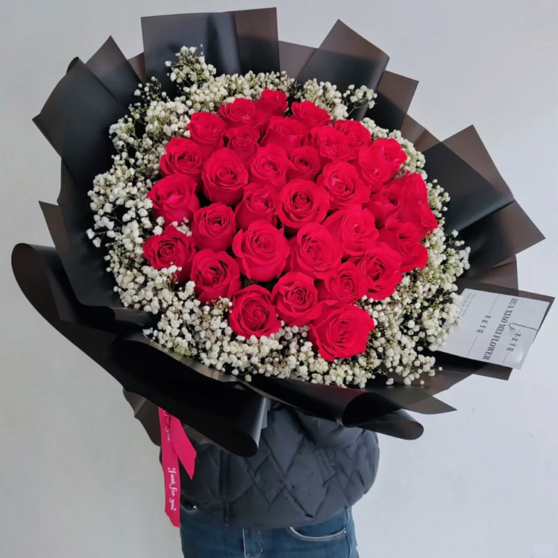 花 材:33朵红玫瑰,满天星环绕。