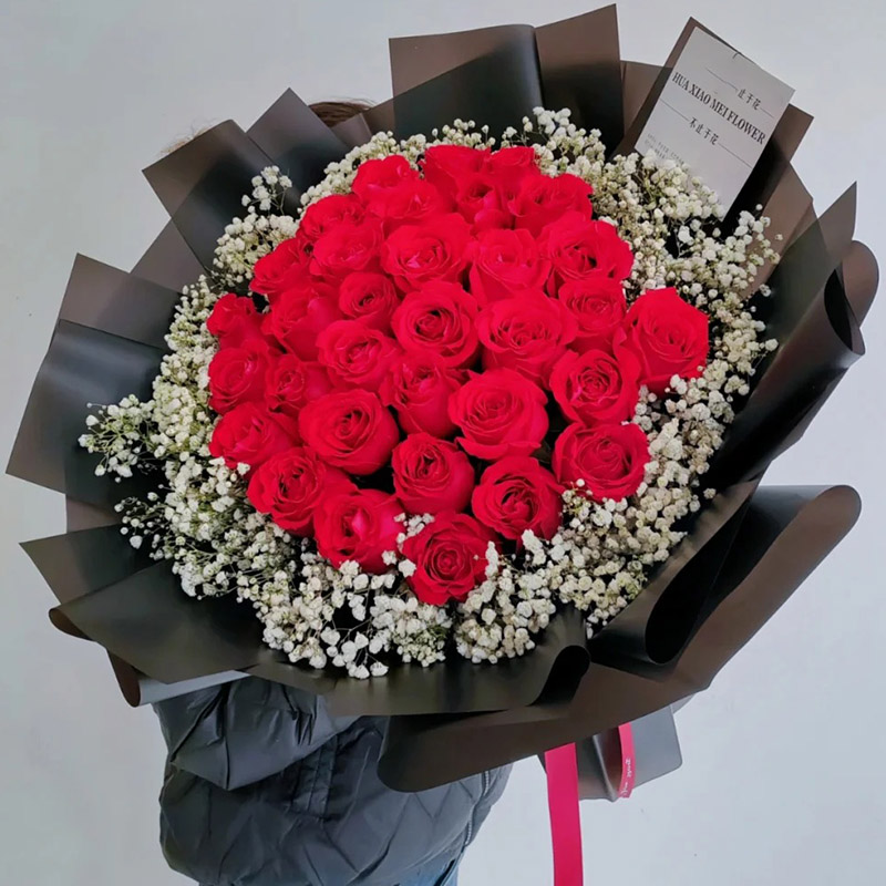 花材: 33朵红玫瑰,满天星环绕。