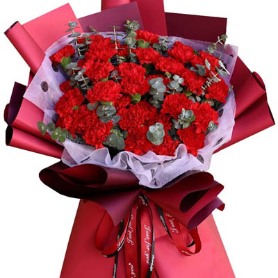 花 材:33朵精品康乃馨,搭配尤加利叶装饰。