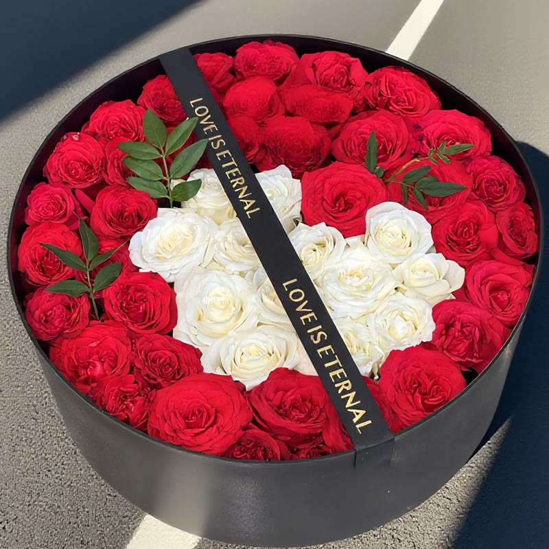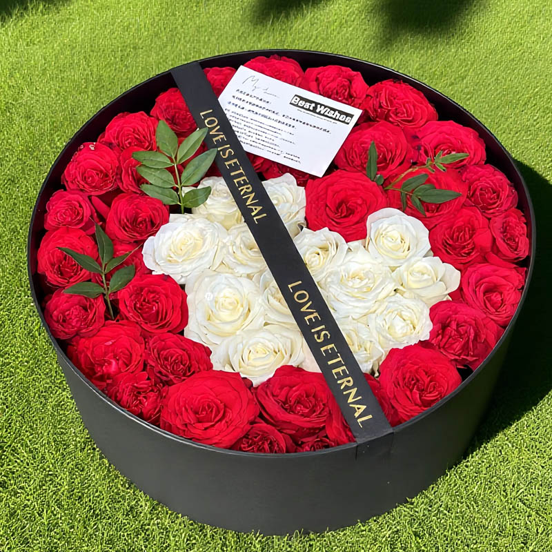 花 材:52朵玫瑰混搭(13朵白玫瑰心形造型,39朵红玫瑰外围环绕),尤加利叶,黑色金字缎带装饰花面。