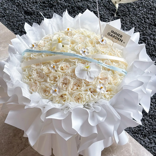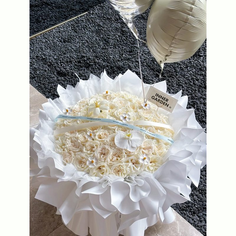 花材: 52支白荔枝玫瑰,1朵白色蝴蝶兰,1支白色郁金香,7支干花紫罗兰,2个气球,1条丝带装饰花面。白色纸多层包装。
