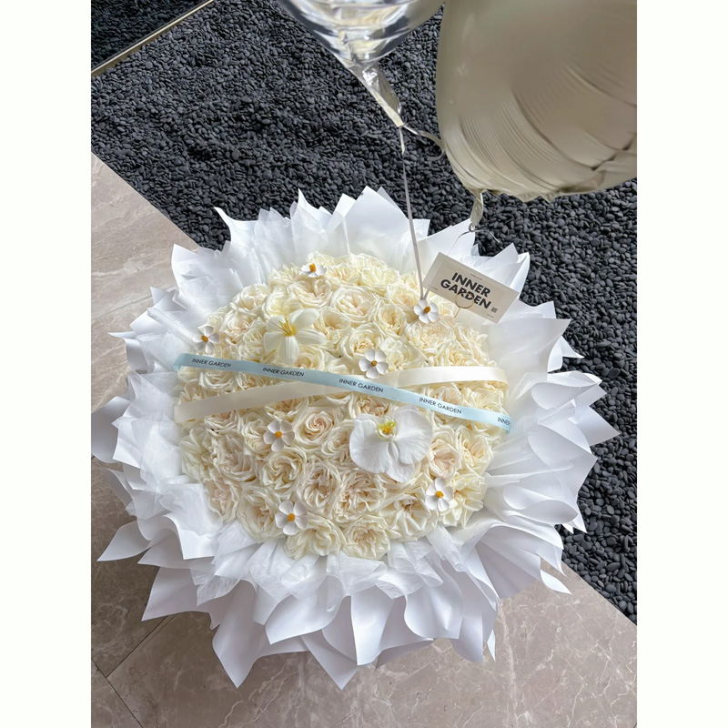 花 材:52支白荔枝玫瑰,1朵白色蝴蝶兰,1支白色郁金香,7支干花紫罗兰,2个气球,1条丝带装饰花面。白色纸多层包装。