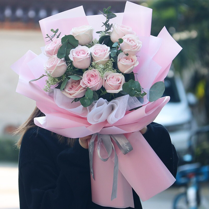 花材: 11朵精品粉玫瑰,搭配白色满天星,尤加利叶装饰。