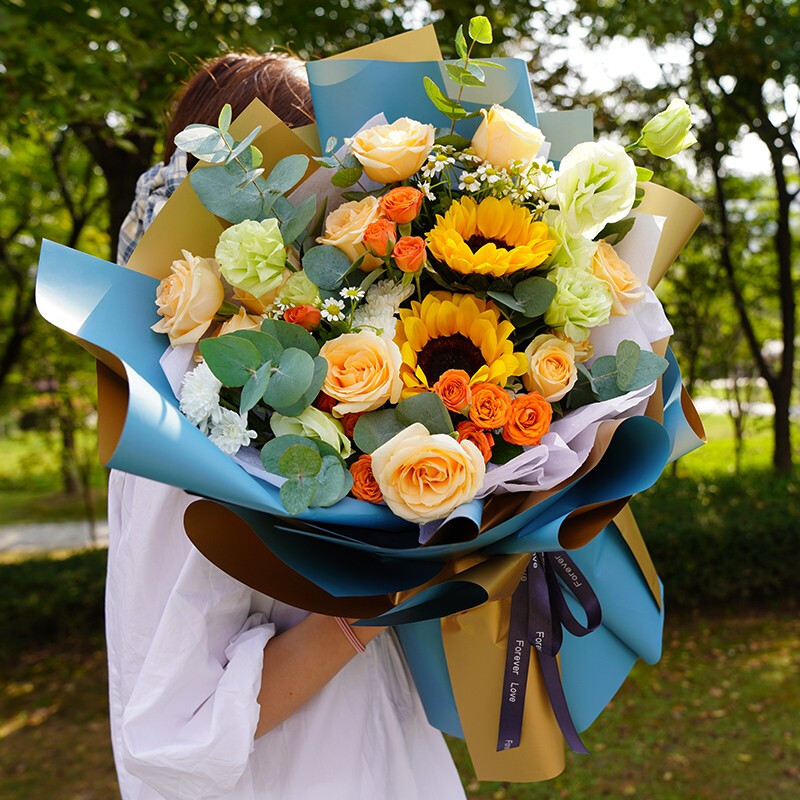 花 材:精选2支向日葵,11朵香槟玫瑰,3支多头橙色小玫瑰,3支洋桔梗,搭配尤加利叶装饰。
