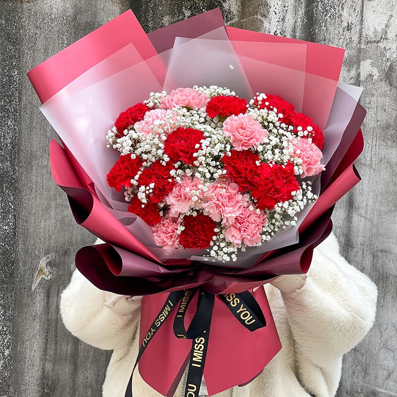 花 材:19朵混色康乃馨(红色、粉色),搭配满天星点缀。