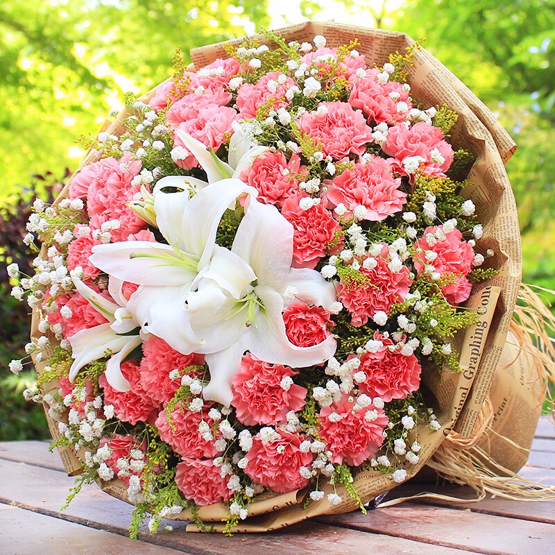 花 材:精选33支粉色康乃馨,2支多头白色香水百合,搭配黄莺、满天星装饰 。