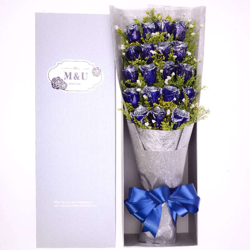 花材: 19朵精品蓝色妖姬,搭配满天星、黄莺装饰。