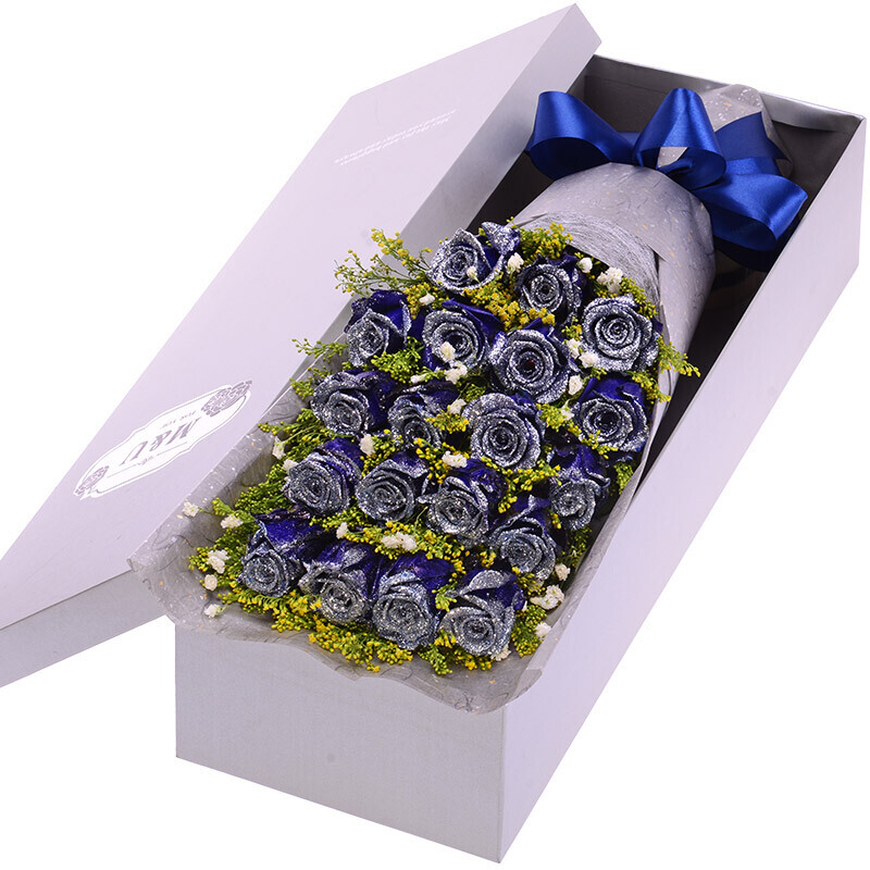 包装: 银丝纸内衬,银色印花纸束扎,宝蓝色蝴蝶结,银色精美礼盒装。
