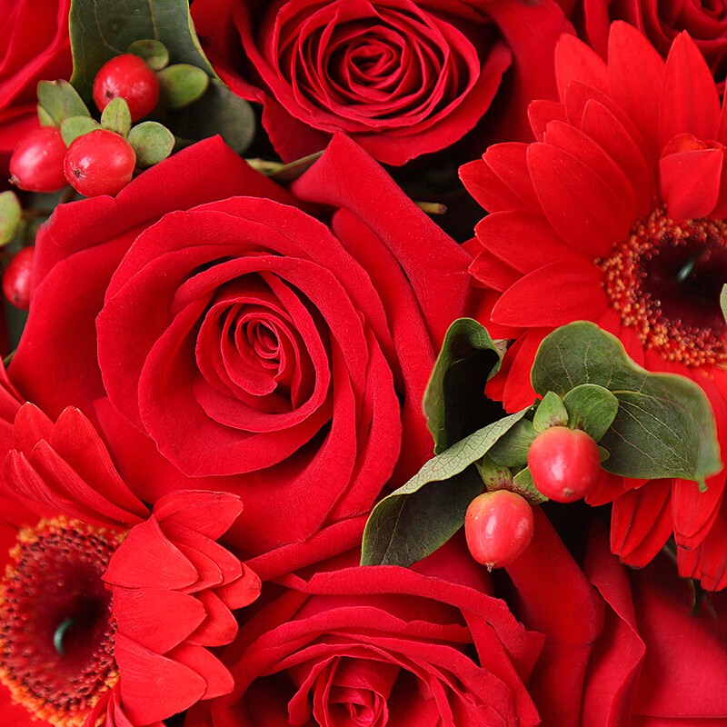 花 材:精选33朵红玫瑰,6支红色太阳花,火龙珠、尤加利尖叶装饰。