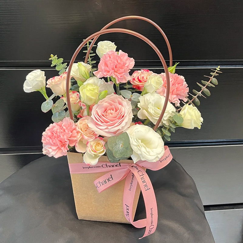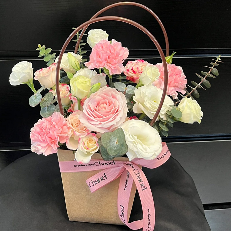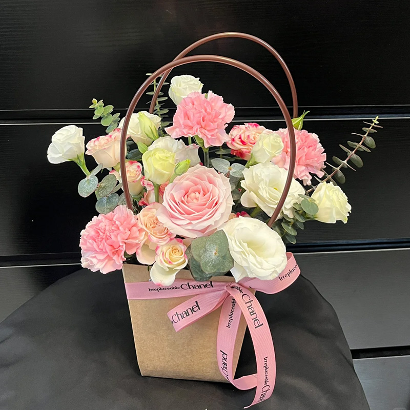 包装: 精美纸质手提花篮,粉色丝带系蝴蝶结装饰(篮子和配饰等具体以当地实物为准)。