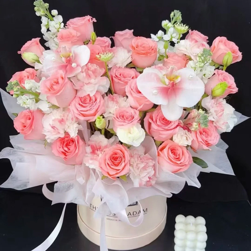 花材: 26枝戴安娜粉玫瑰,6枝粉色康乃馨,2朵白色蝴蝶兰(喷粉色),4枝白色紫罗兰,4支多头洋桔梗,尤加利叶装饰。