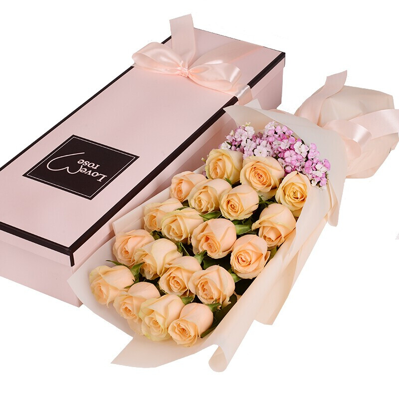花 材:19朵香槟玫瑰,搭配相思梅。