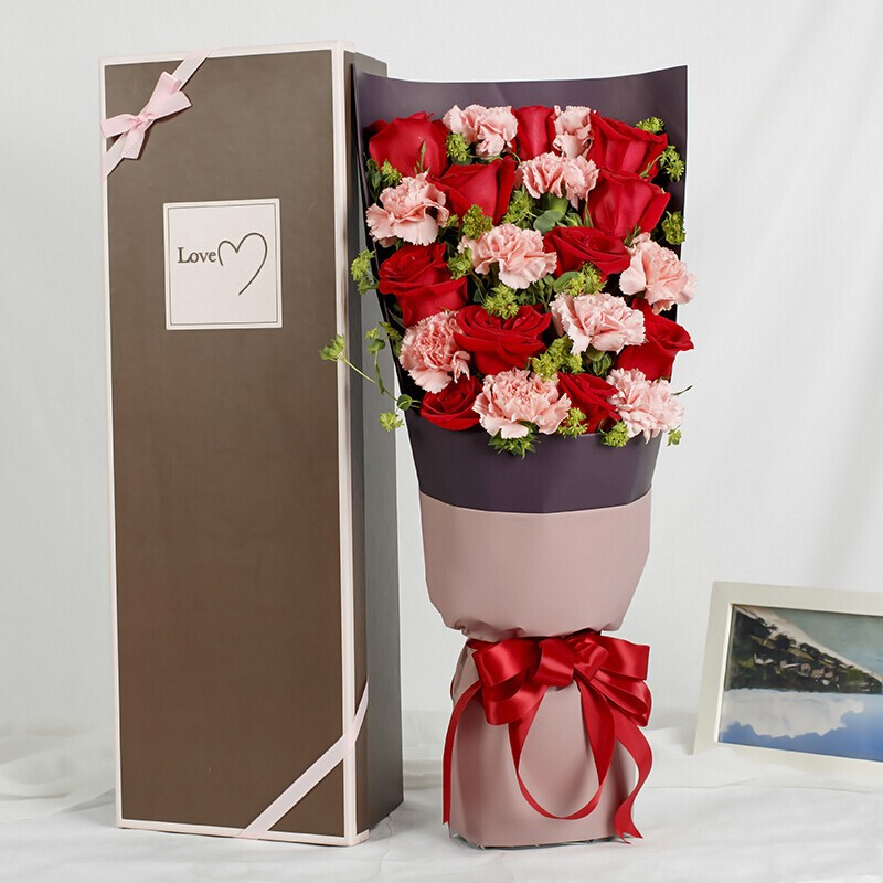 花 材:精选11朵红玫瑰,10朵粉色康乃馨,搭配叶上黄金点缀。