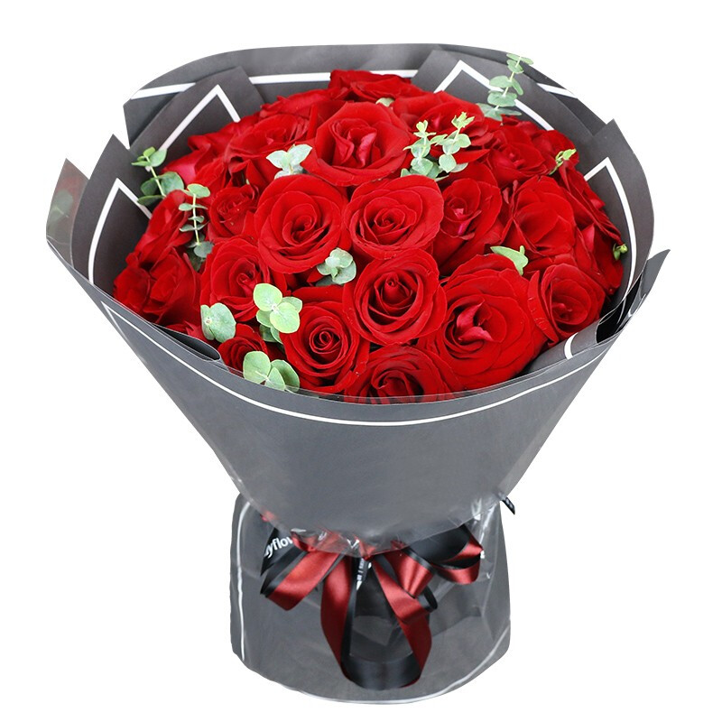 花材: 33朵红玫瑰,搭配尤加利叶装饰。