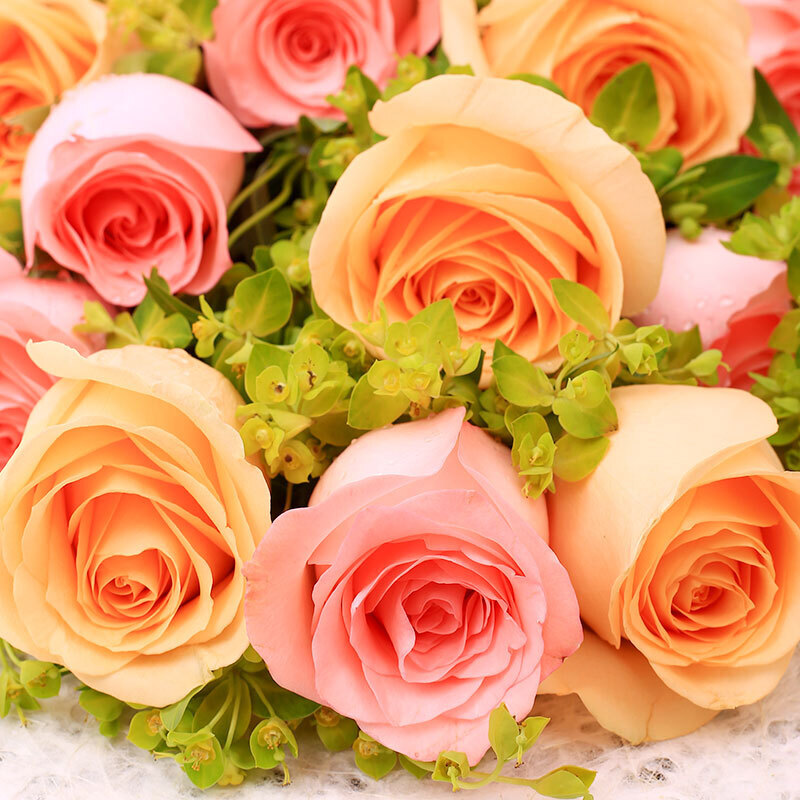 花材: 19朵精品玫瑰(粉色玫瑰10支,香槟色玫瑰9支),搭配叶上黄金。