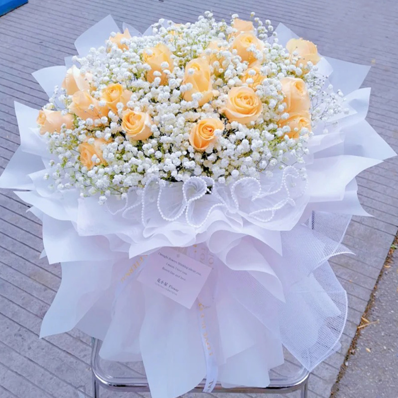 花 材:19朵香槟玫瑰,搭配满天星丰满装饰。
