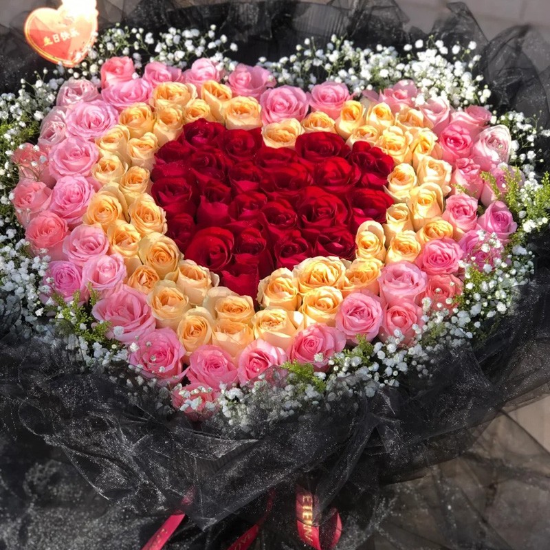 花 材:99朵玫瑰混搭心形造型,红玫瑰在最里层,香槟玫瑰居中,粉玫瑰外围,满天星、黄莺草环绕装饰。