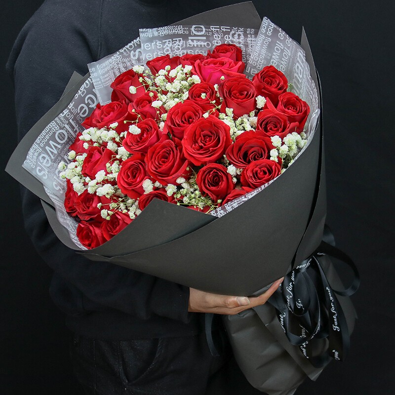 花材: 33朵卡罗拉红玫瑰,满天星点缀。