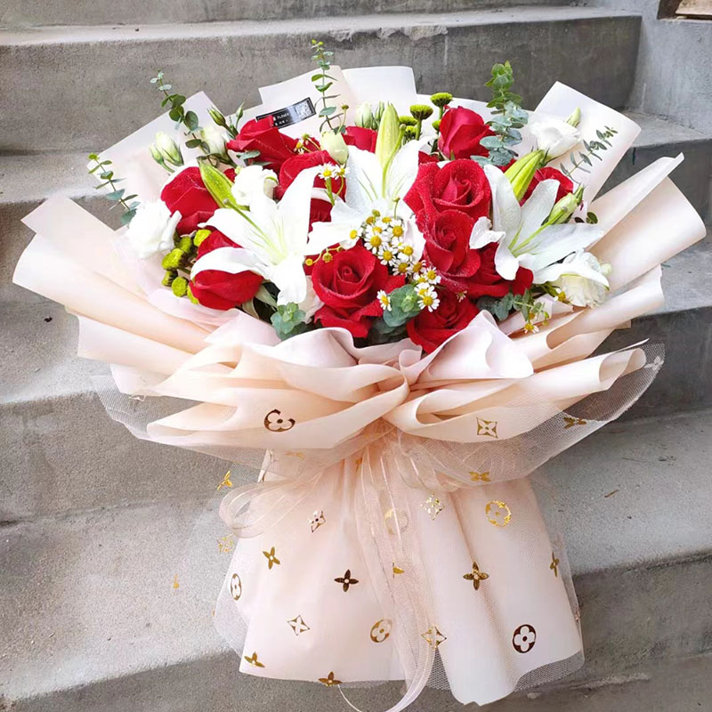 花 材:12朵红玫瑰,2支多头白色香水百合,搭配尤加利叶、洋甘菊、小雏菊装饰。