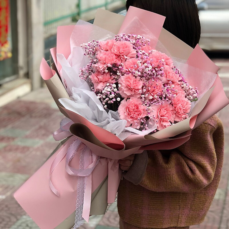 花材: 19朵粉色康乃馨,粉色满天星点缀。