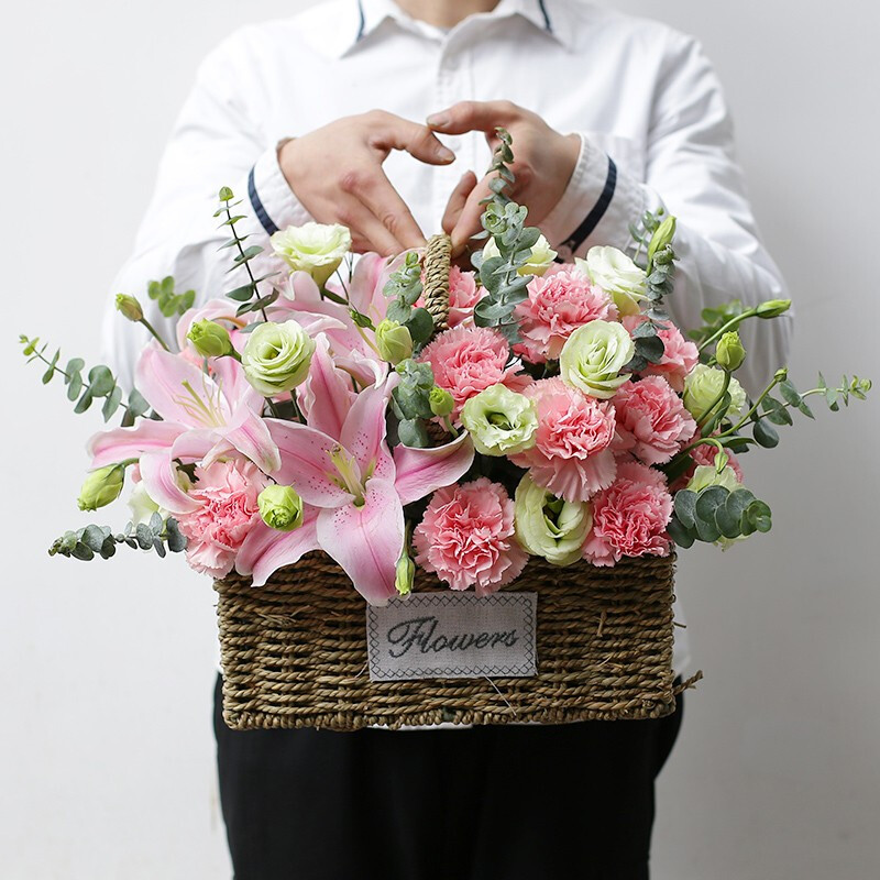 花材: 11朵粉色康乃馨,4朵粉色香水百合,8支绿色洋桔梗,搭配尤加利叶装饰。