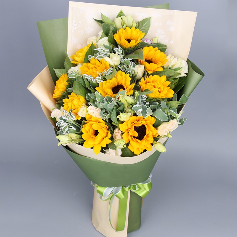 花材: 10支向日葵,搭配适量栀子叶、桔梗、叶上花。