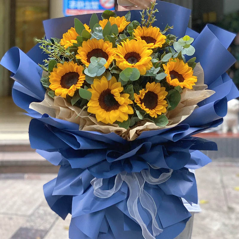 花 材:精选9支向日葵花束,尤加利叶装饰。
