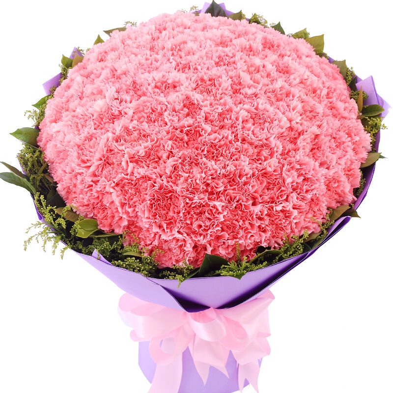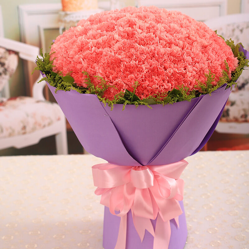 花材: 99支粉色康乃馨,搭配绿叶、黄莺。