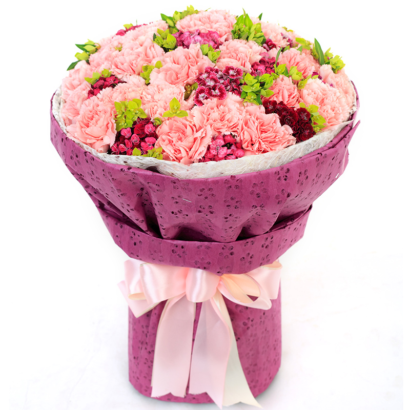 花 材:33支粉色康乃馨,搭配适量长寿花、石竹
