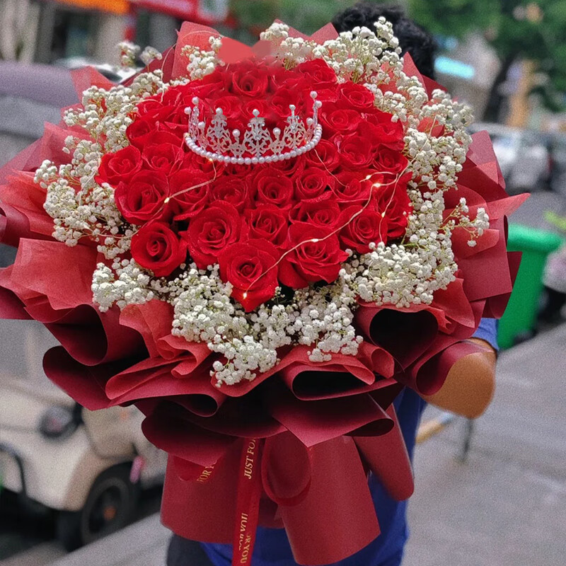 花 材:33朵红玫瑰,1个皇冠(款式随机),1条灯带,搭配白色满天星环绕。