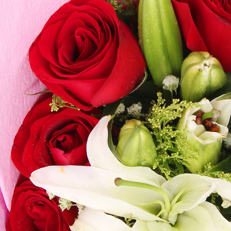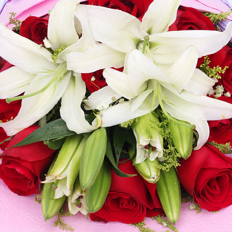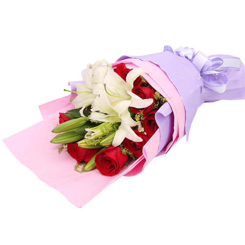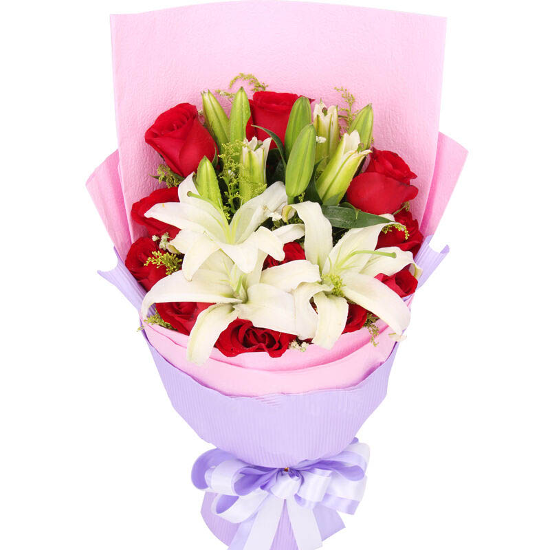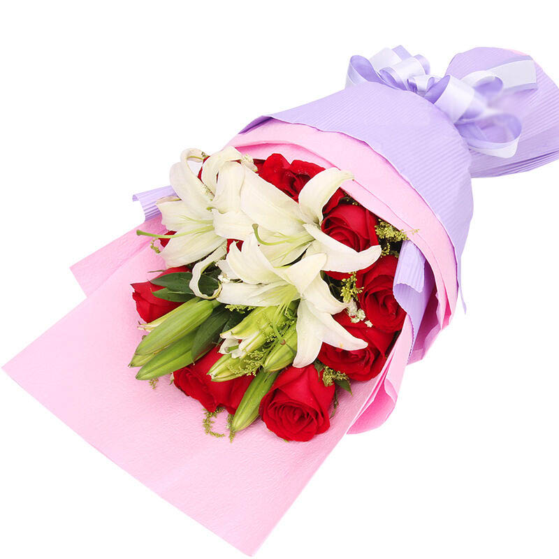 花材: 11朵红玫瑰,3支多头白色香水百合,黄莺点缀。