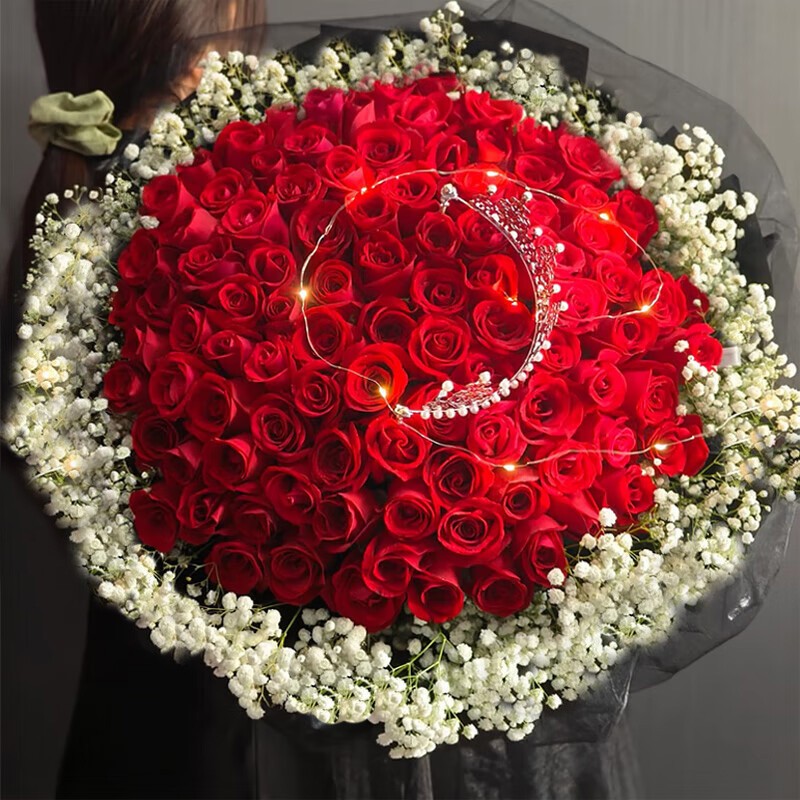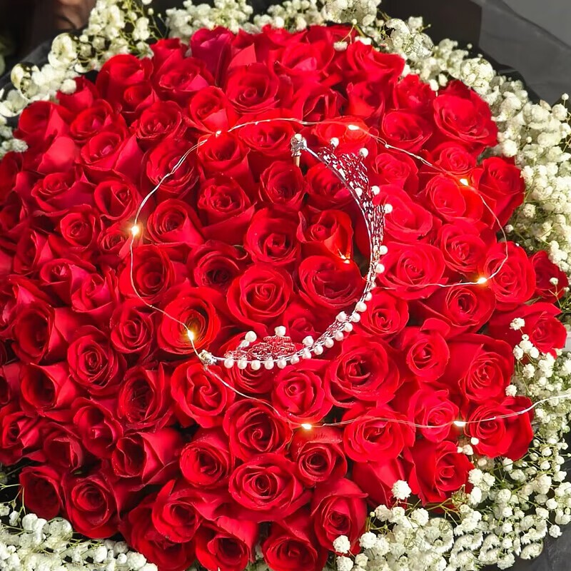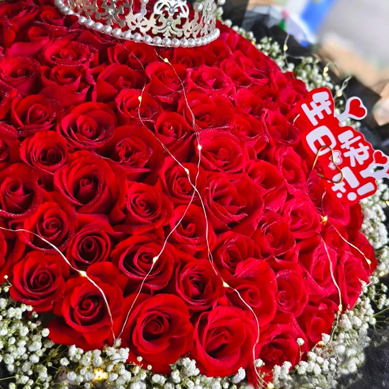 花材: 99支顶级红玫瑰,搭配皇冠、灯带装饰,满天星环绕。