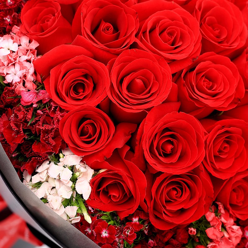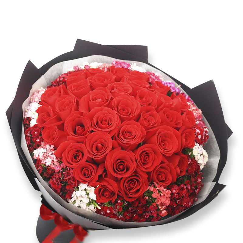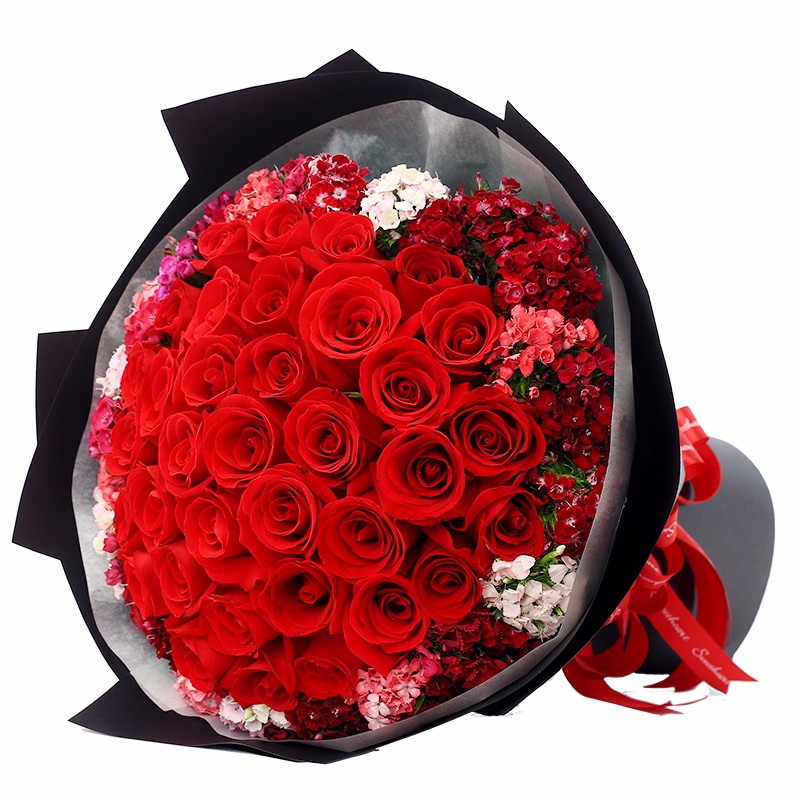 花 材:33支精品红玫瑰,外围搭配适量红色、粉色、白色石竹梅。