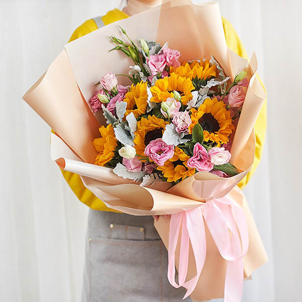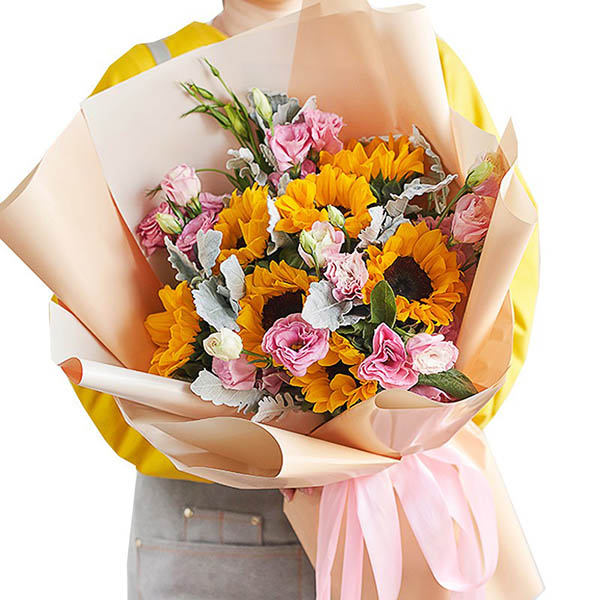 花材: 7支向日葵,粉桔梗丰满间插,搭配银叶菊和栀子叶。