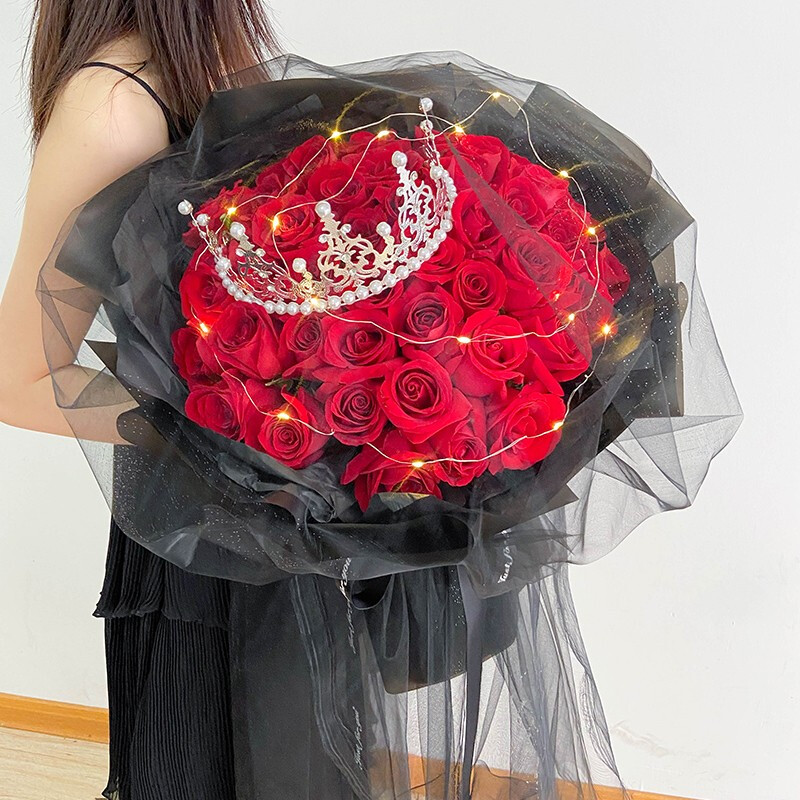 • 花材33支精品红玫瑰,可发光灯带+精美皇冠装饰。