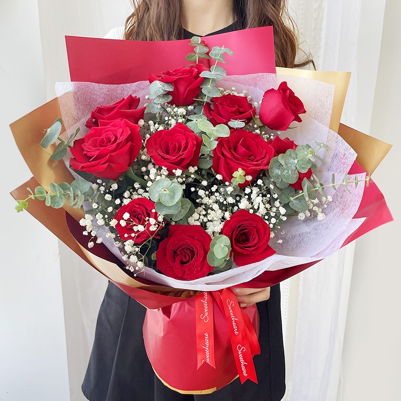 - 花材11枝卡罗拉红玫瑰、搭配白色满天星、尤加利点缀。